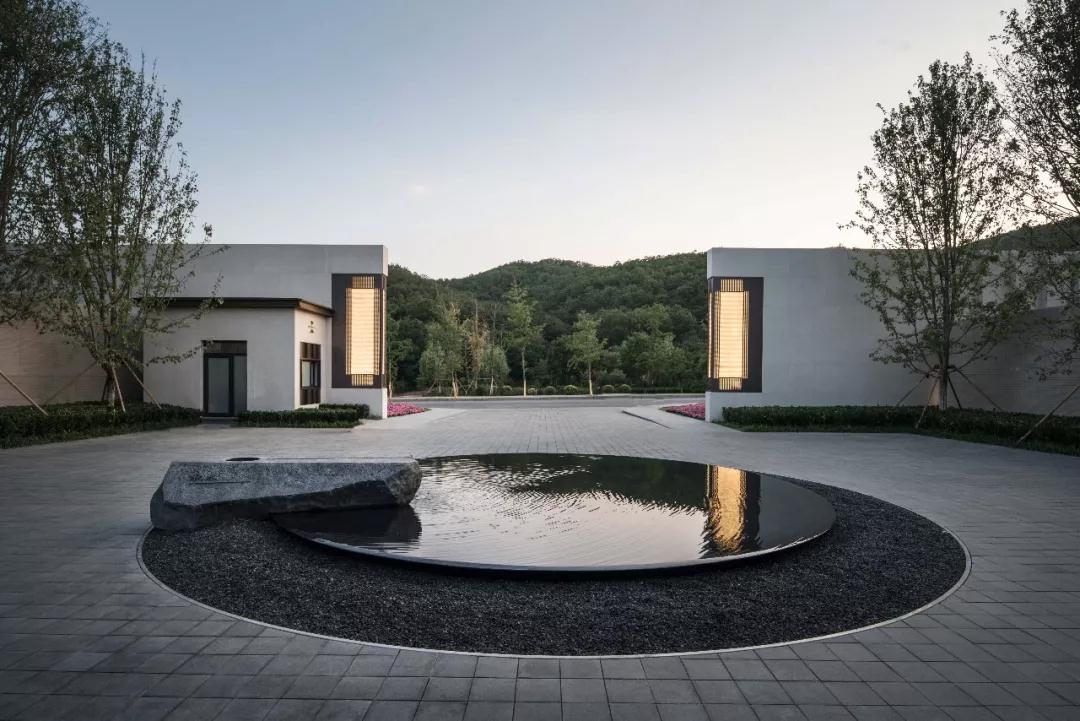 山居,自然美景當(dāng)是角兒。以水為脈,一汪“秋水”將對(duì)面的山巒林木倒映池中,隨著日照的東升西落,水中山景倒影也隨著浮動(dòng)形成一副生動(dòng)的山水畫卷。簡(jiǎn)素古樸的方磚,穩(wěn)重的置石,潺潺清泉,方與圓的原始圖騰搭配,與山林自然的動(dòng)靜呼應(yīng),讓居住的人感受到平靜、安寧,還有一份心之悠遠(yuǎn)。