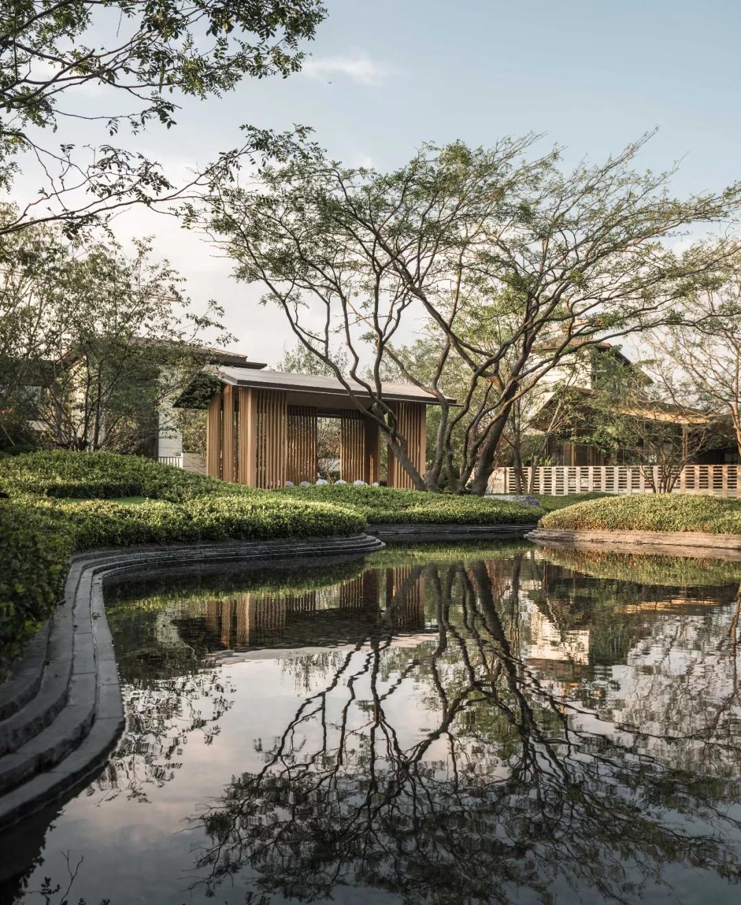 后花園名喚“云起”,整體布局疏密自然,以日本足立美術(shù)館為設(shè)計(jì)原型。設(shè)計(jì)的精髓在于“庭院就是一幅畫”的創(chuàng)園理念,以借景的方式把原本不屬于園區(qū)的山水,通過(guò)視覺(jué)空間設(shè)計(jì)融入園中。