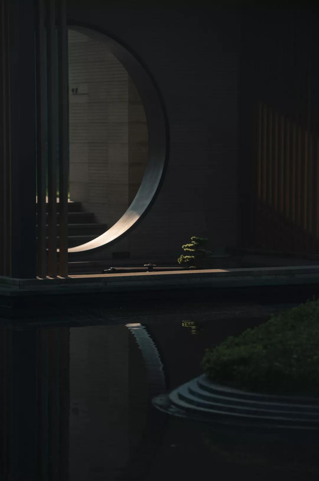 行至長(zhǎng)廊盡端,對(duì)景龍山相襯,一輪明月升起,虛中有實(shí),與秋水門相呼應(yīng),取名“印月”。露而不盡,展現(xiàn)了空間延展性。墻是空間的阻隔,而月洞門將人與自然、空間的連接,營(yíng)造尋林清幽的空間敘事,透過(guò)月洞門看見(jiàn)山林疏影,看見(jiàn)的是心中的詩(shī)意山水,親近自然的愜意。