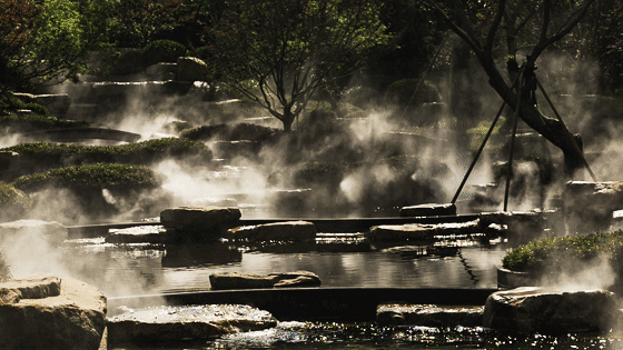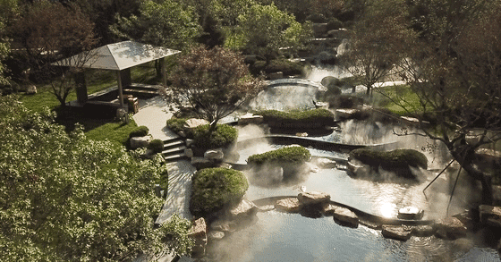 清泉于山間溢出,疊石立于山澗溪流中。通過(guò)一園一路,一亭一橋,遠(yuǎn)以觀山水,中以賞密草,近以聞花香,以此園內(nèi)流水、秀木、紅楓、櫻花,與金石、小葉黃洋修剪成扁扁圓圓的球狀,構(gòu)成一幅幽遠(yuǎn)寧?kù)o的畫面。