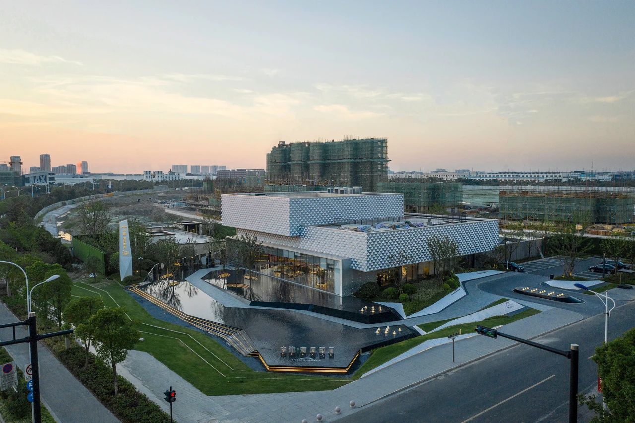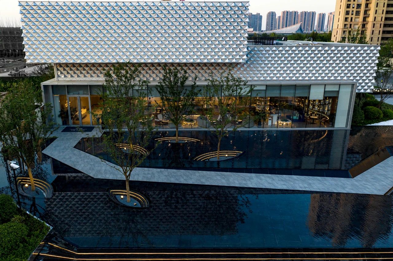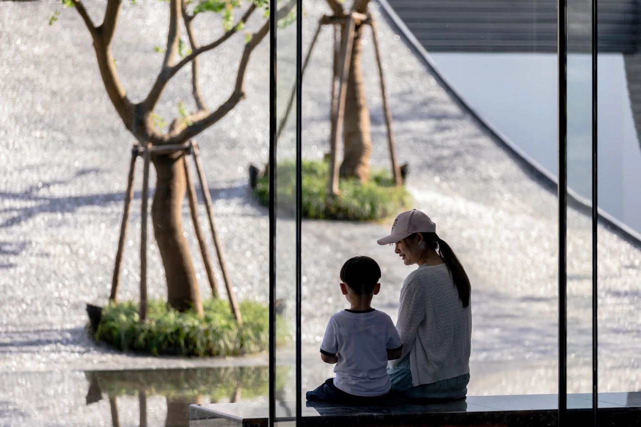 合適的水系承托著建筑的倒影,下沉的道路使人行與市政道路建立良好的隔離,保證人行進(jìn)入的品質(zhì)和舒適度。