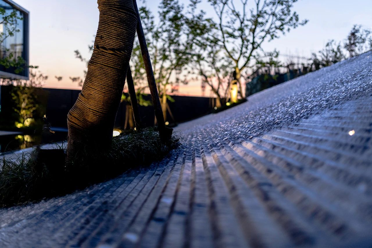 園中的景觀不追求浮夸,以條狀線(xiàn)性的元素來(lái)演繹水流,豐富空間形式的同時(shí)將視線(xiàn)收縮,通過(guò)轉(zhuǎn)折的空間變換營(yíng)造探幽的好奇感。