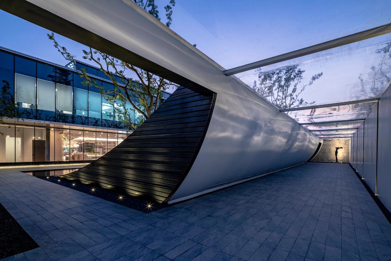 我們希望創(chuàng)造一個(gè)在運(yùn)河記憶、客戶(hù)體驗(yàn)、藝術(shù)景觀,三個(gè)方面達(dá)到共鳴的設(shè)計(jì),以化整為一的后場(chǎng)處理手法,使視線(xiàn)由室內(nèi)過(guò)度到室外。