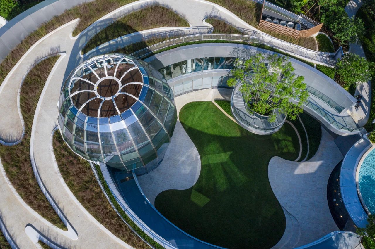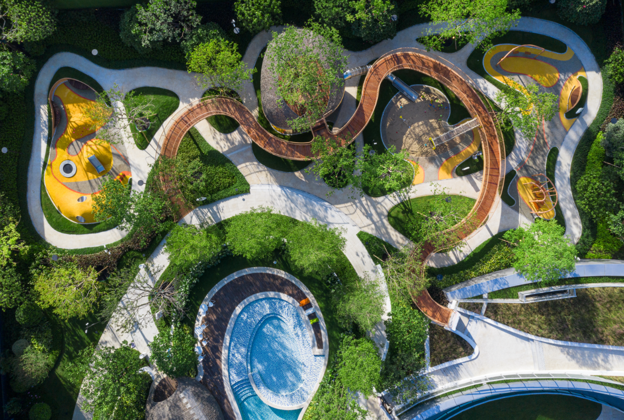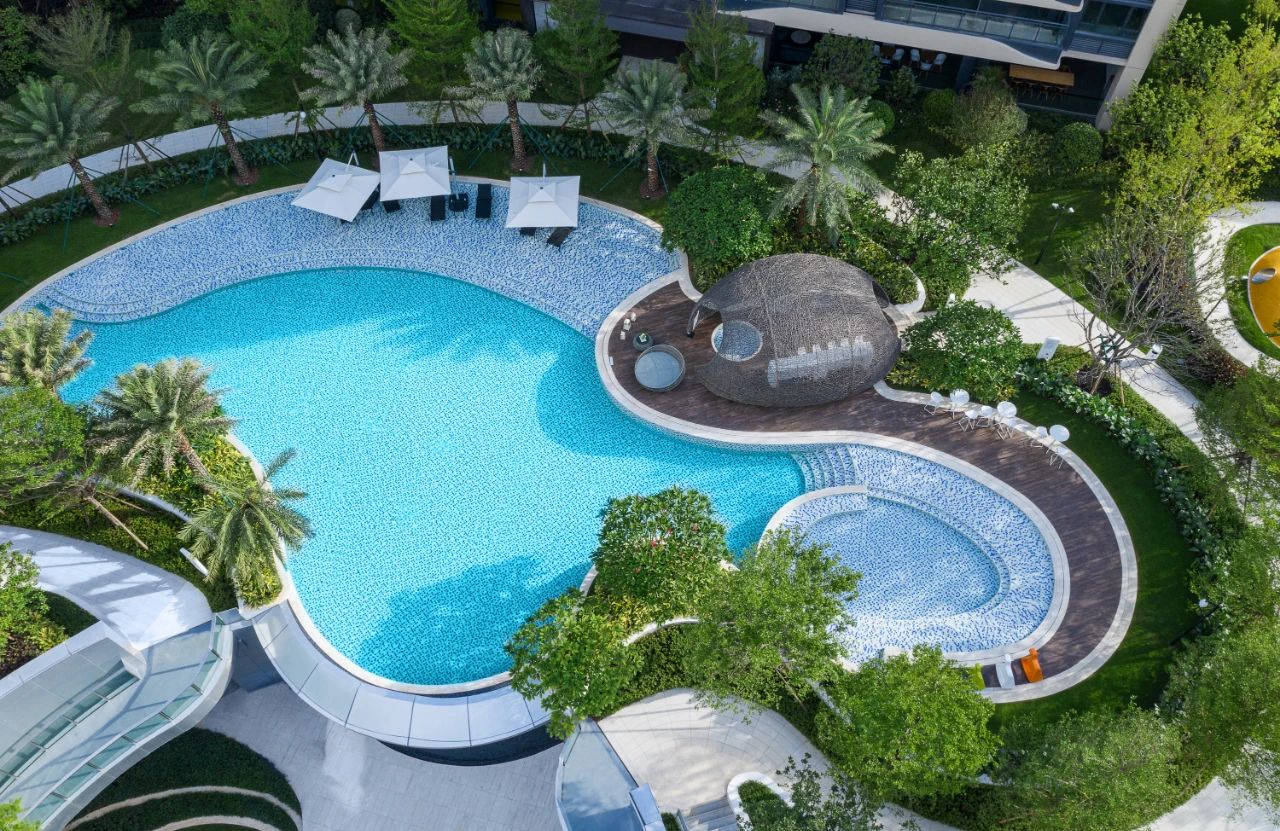 我們希望打造足不出戶的度假體驗——無邊際的藝術式泳池,鳥巢形態(tài)的構筑物,都在傳達著泳池區(qū)度假的氛圍感。