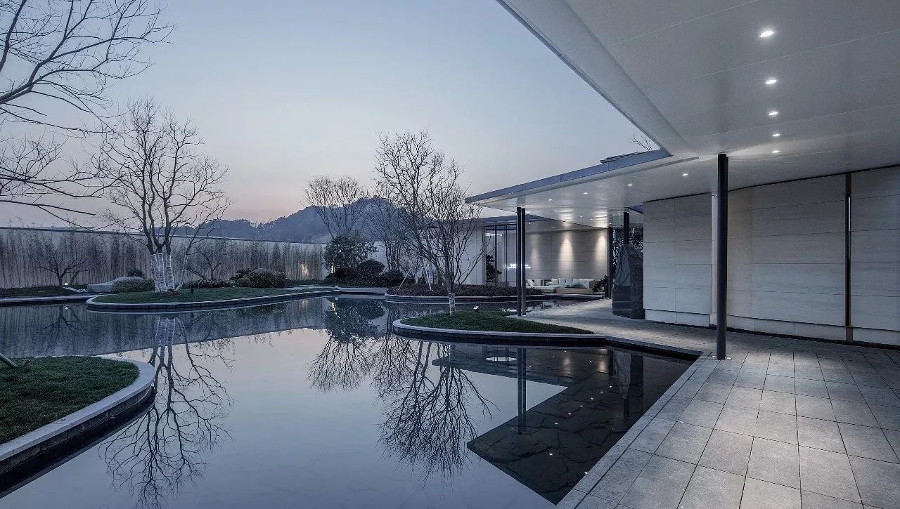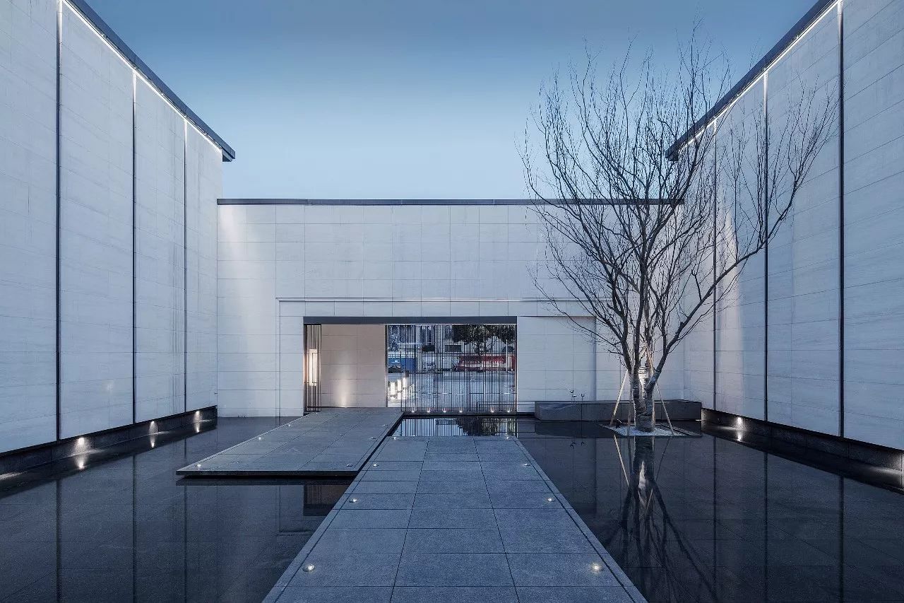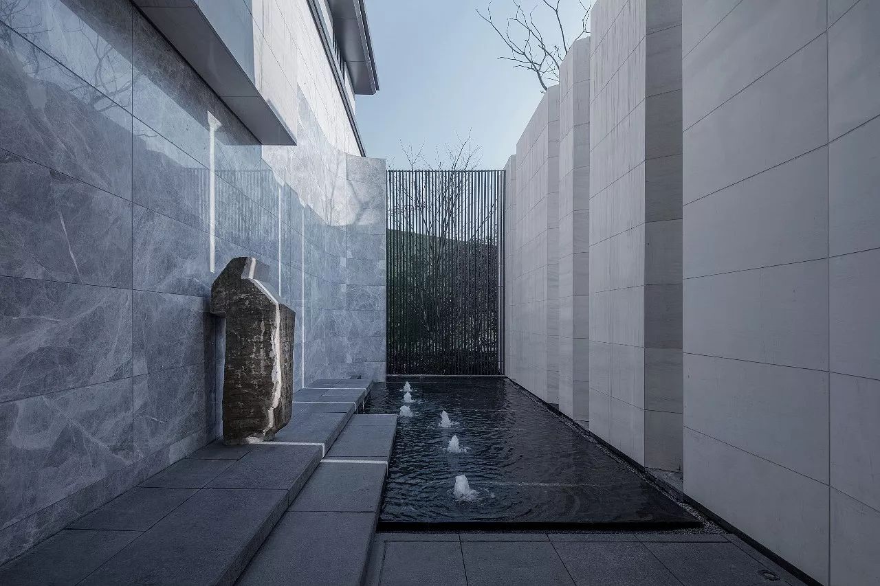 前庭空間簡潔,有序。水景分為動靜兩部分,入口小水面跌水嘩嘩有聲,主步道兩側(cè)大水面又靜若處子,最大限度放大整體空間。人行水上而影映其中。