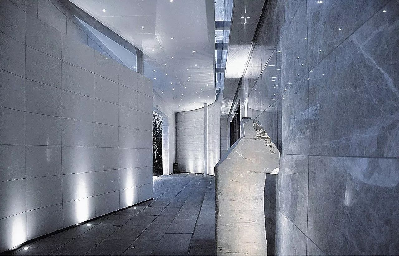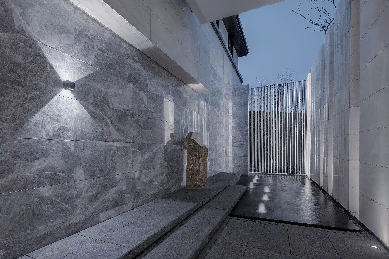 檀院的主入口空間一改傳統(tǒng)對正布局轉(zhuǎn)而采用更加純粹的建筑語匯和手法,通過對光影及高對比材質(zhì)的組合,利用有限的進(jìn)深空間塑造出別有韻味的半室內(nèi)空間。