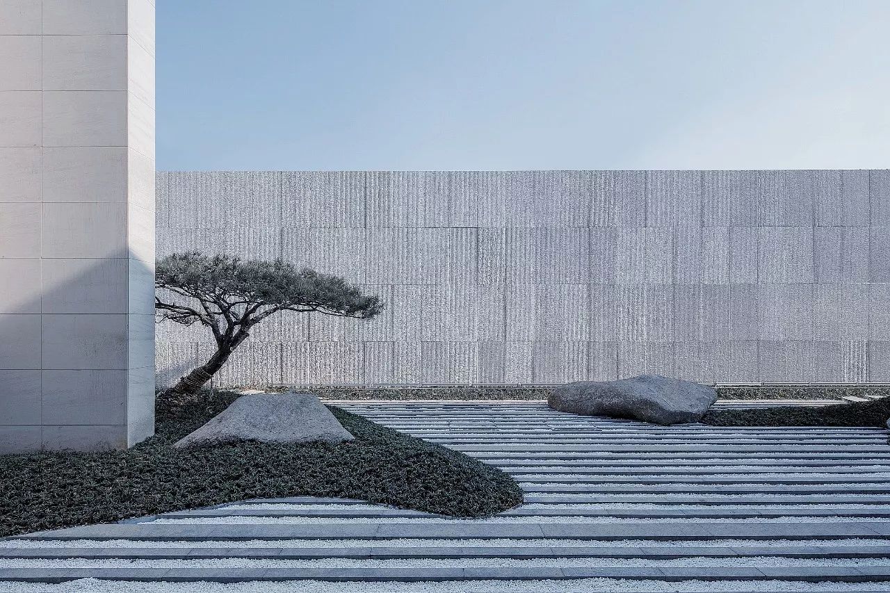 奇松巨石,借用建筑空間的對稱感,將景墻延伸穿插,形成高低層次的進(jìn)深空間。奇松半露,巨石橫臥,此水雖枯神未枯。望墻上疏影,品一茗熱茶。