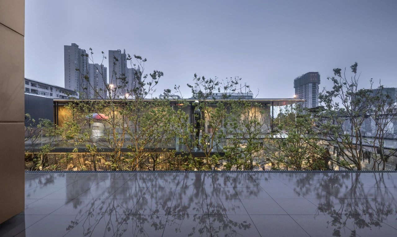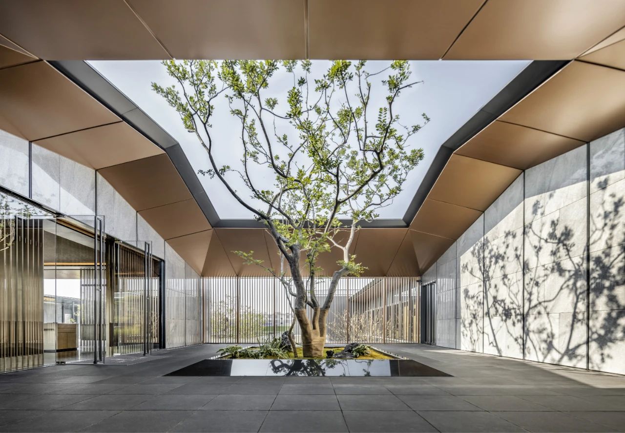 下沉空間中,清雨綿綿,滴答水聲,潔凈陽光斑駁,枝椏半探檐口,青苔依偎青石,竟如入高山流水禪意之境。