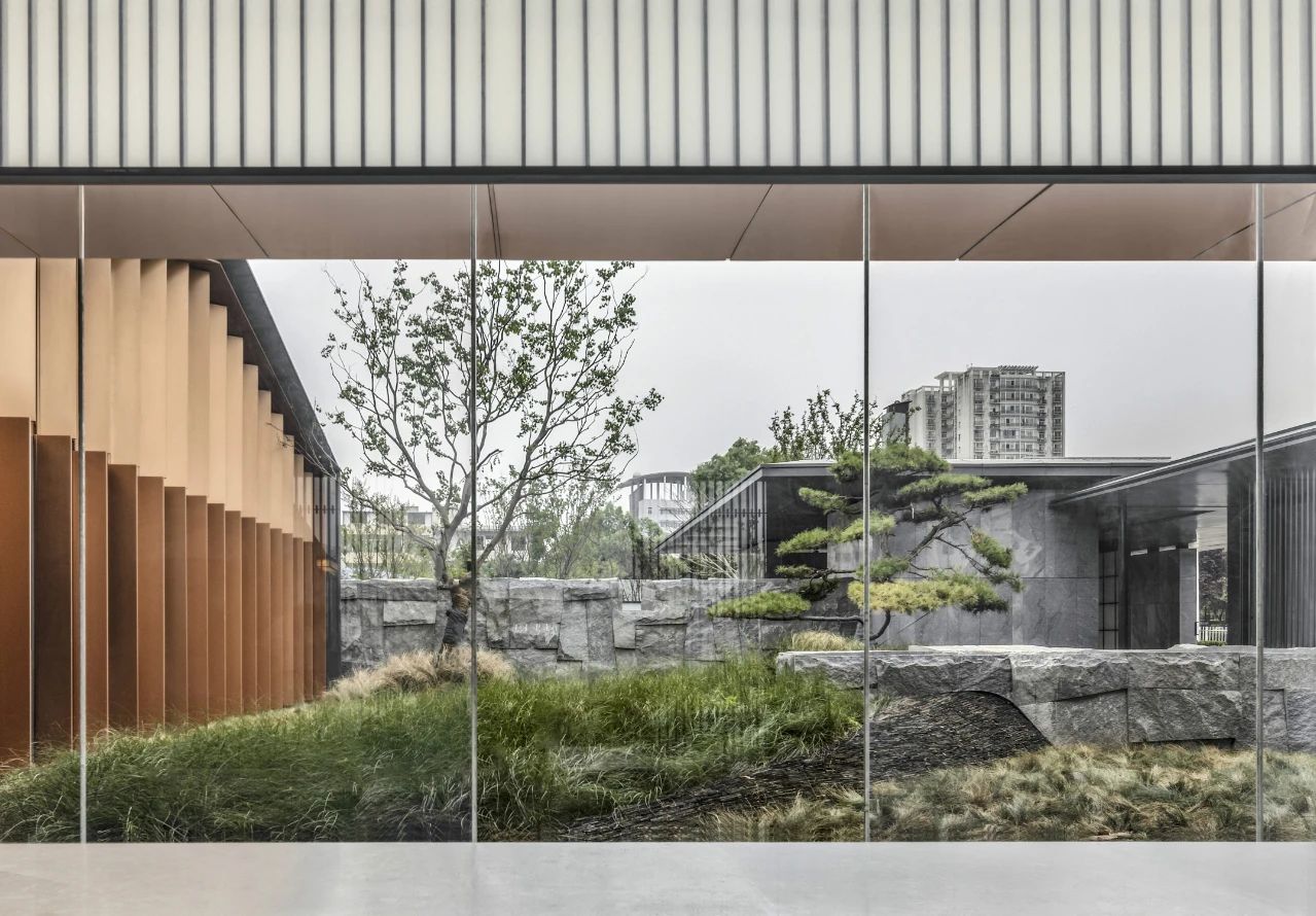 建筑采用大面積玻璃材質(zhì),開拓洽談空間視野,為此,景觀布置出能夠體現(xiàn)四季變幻的浮光掠影。