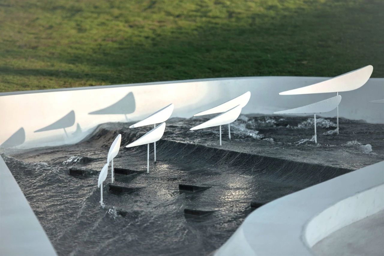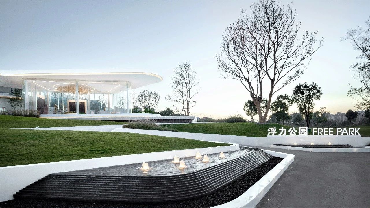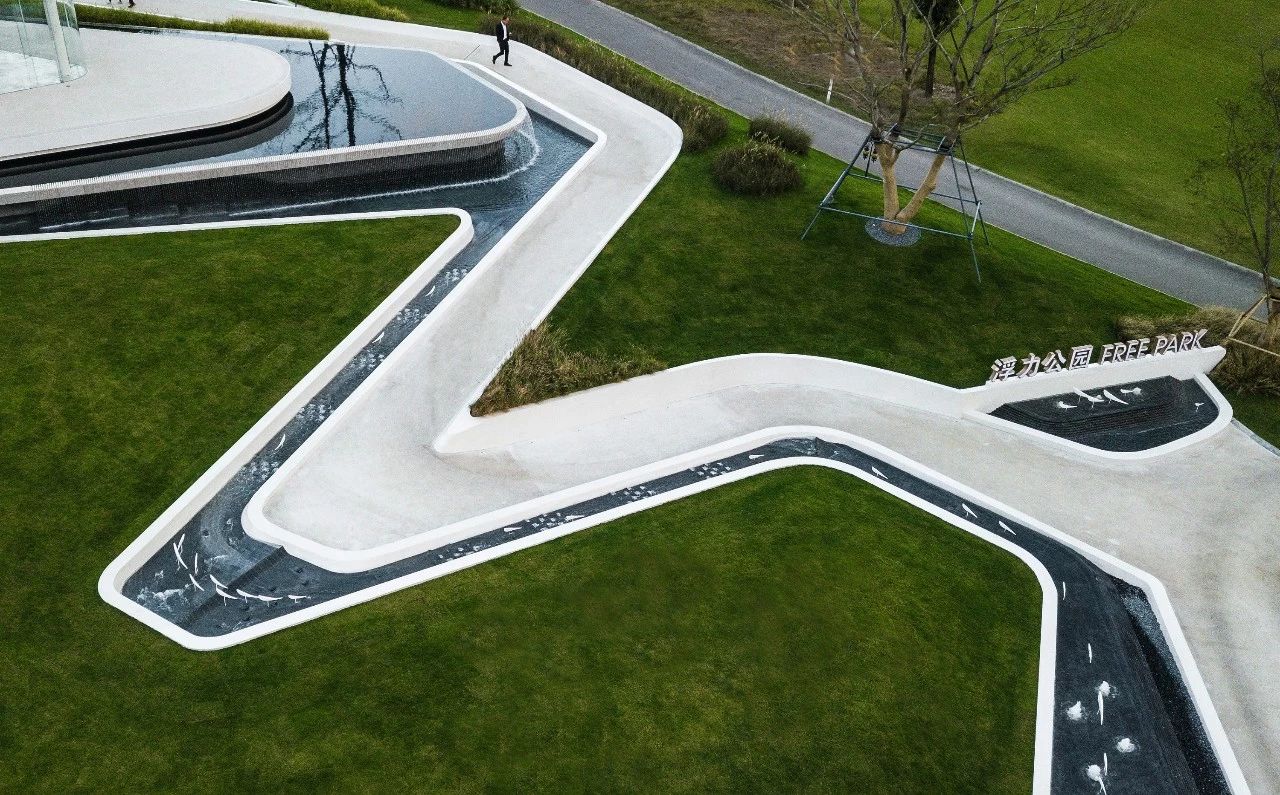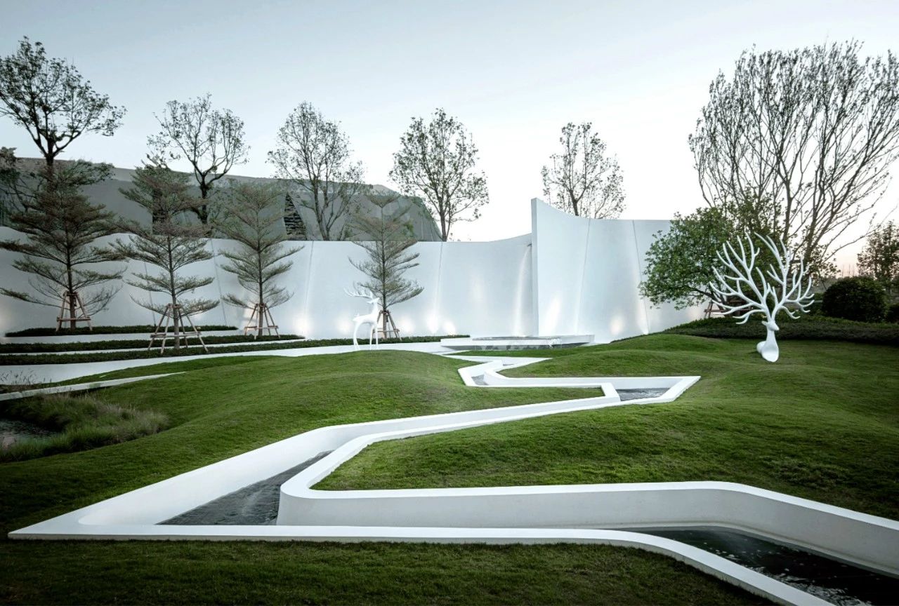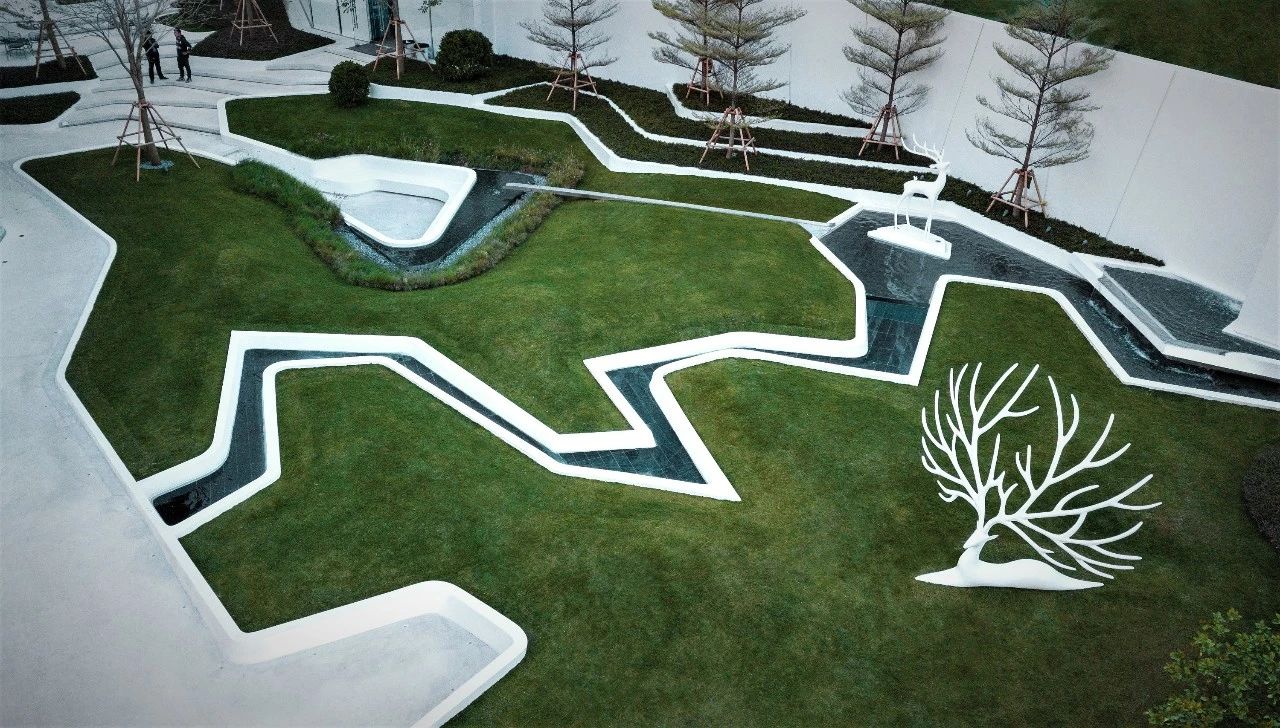 尋溪而上,一路流水潺潺,抽象形態(tài)的魚兒雕塑穿梭著,現(xiàn)代美感呼之欲出。