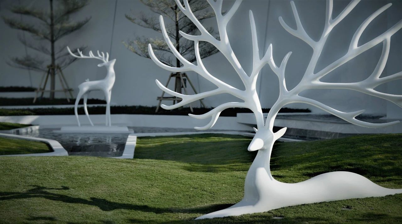 草坪上,兩只小鹿一臥一立,臥鹿徜徉、立鹿觀瀑,形態(tài)可掬的模樣頓增寧靜祥和之感,讓整個(gè)空間更為靈動(dòng)。
