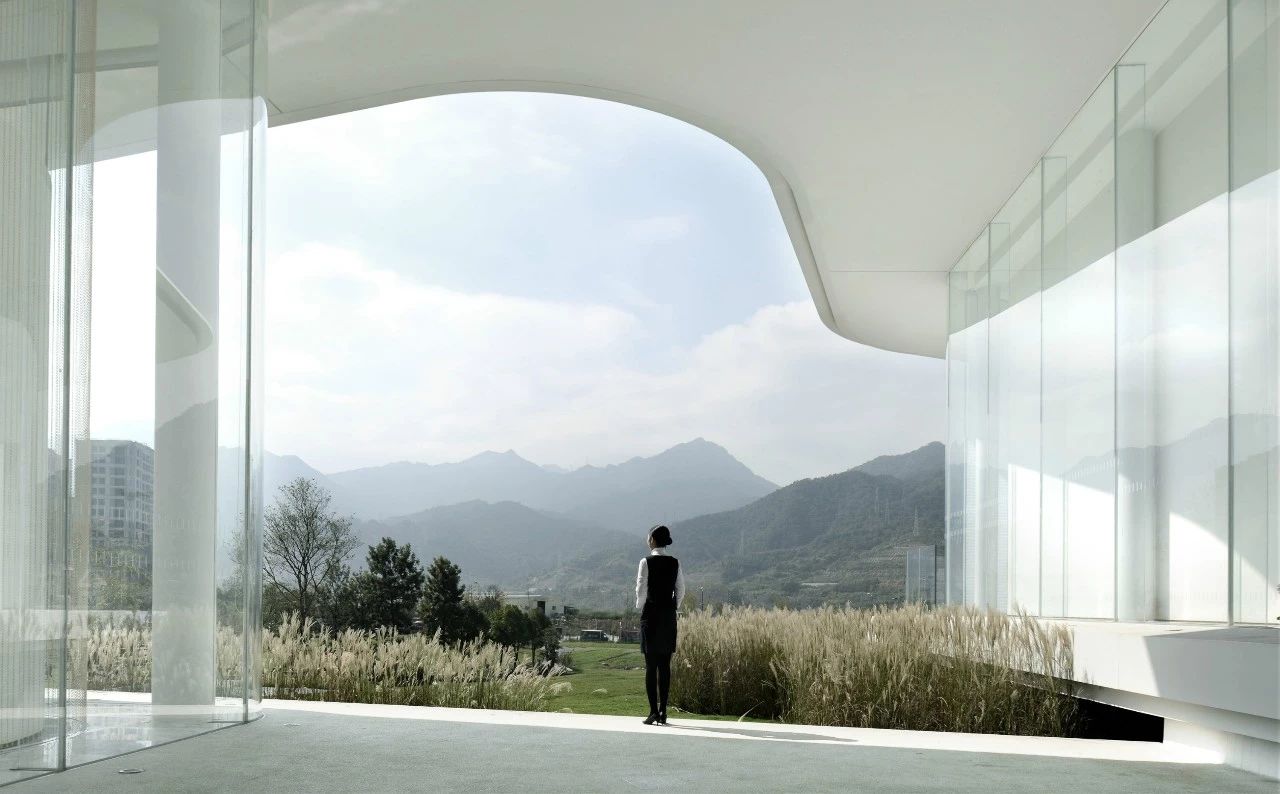 在層巒疊嶂的映襯下,漂浮在山坡上的建筑猶如一座透明水晶宮,具有戲劇沖突性的基調(diào)。