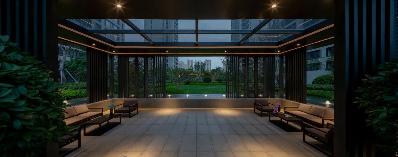 中心景觀花園中,對(duì)稱的特色格欄廊亭營(yíng)造了秩序感,環(huán)繞的水系、用于休憩的軟椅,給游園者提供小憩悠閑之處。