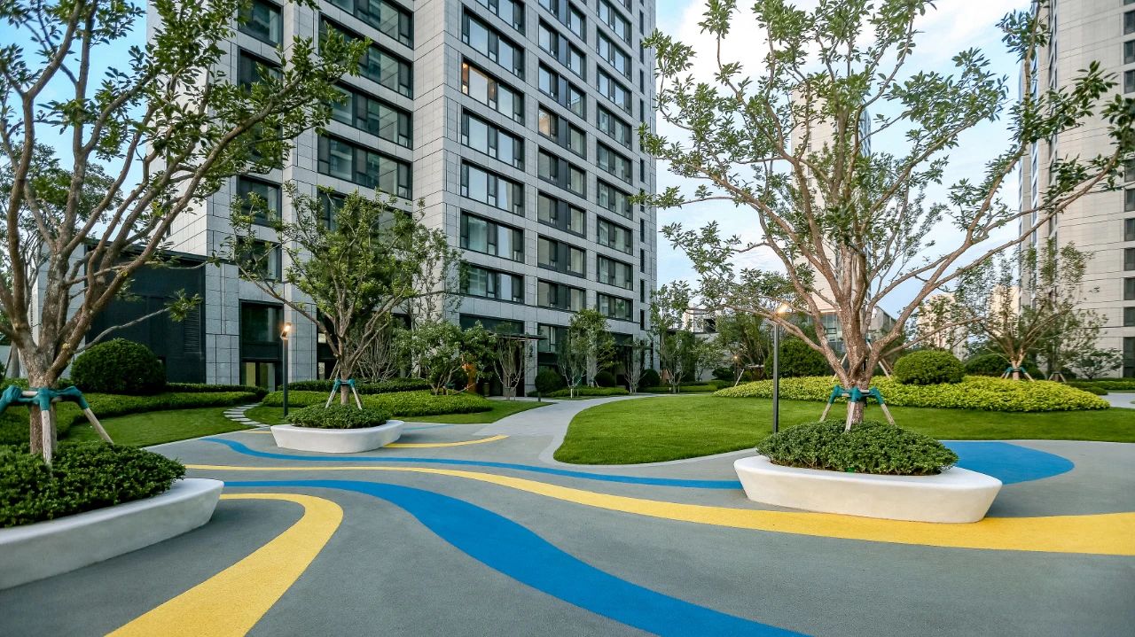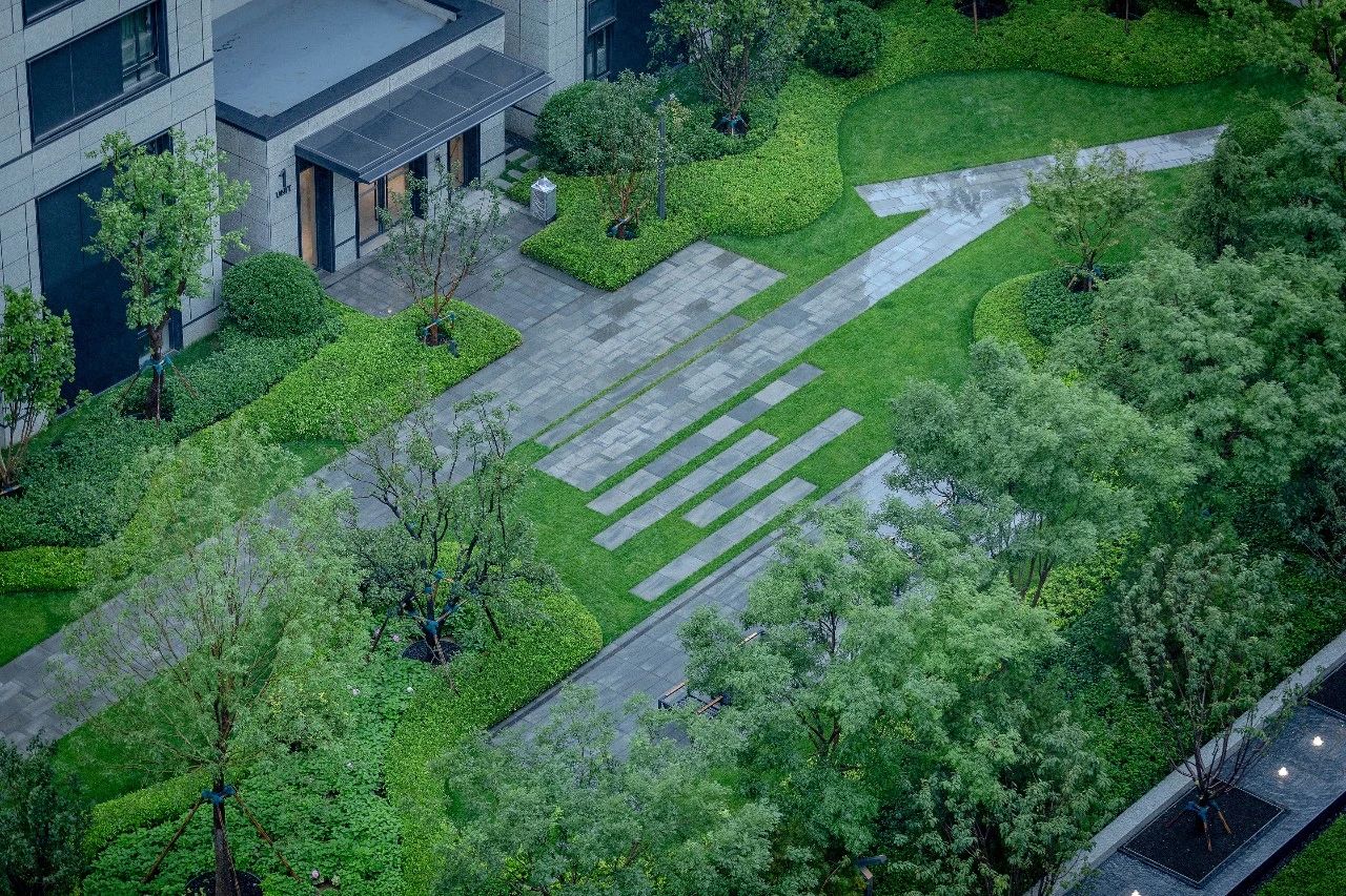 活動(dòng)場(chǎng)地與南北歸家的路線都被融于植物組團(tuán)、草坪和鋪裝之中,干凈純粹的開(kāi)敞空間與核心景觀區(qū)之間形成過(guò)渡,營(yíng)造出安靜舒適的體驗(yàn)。