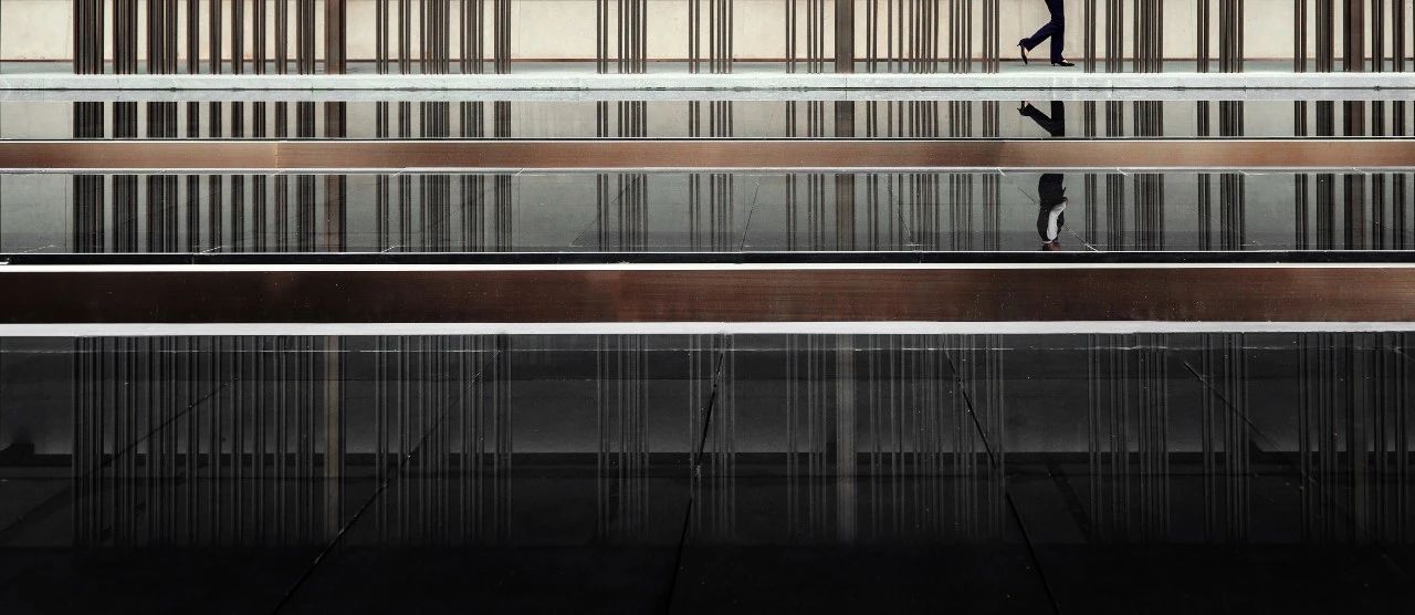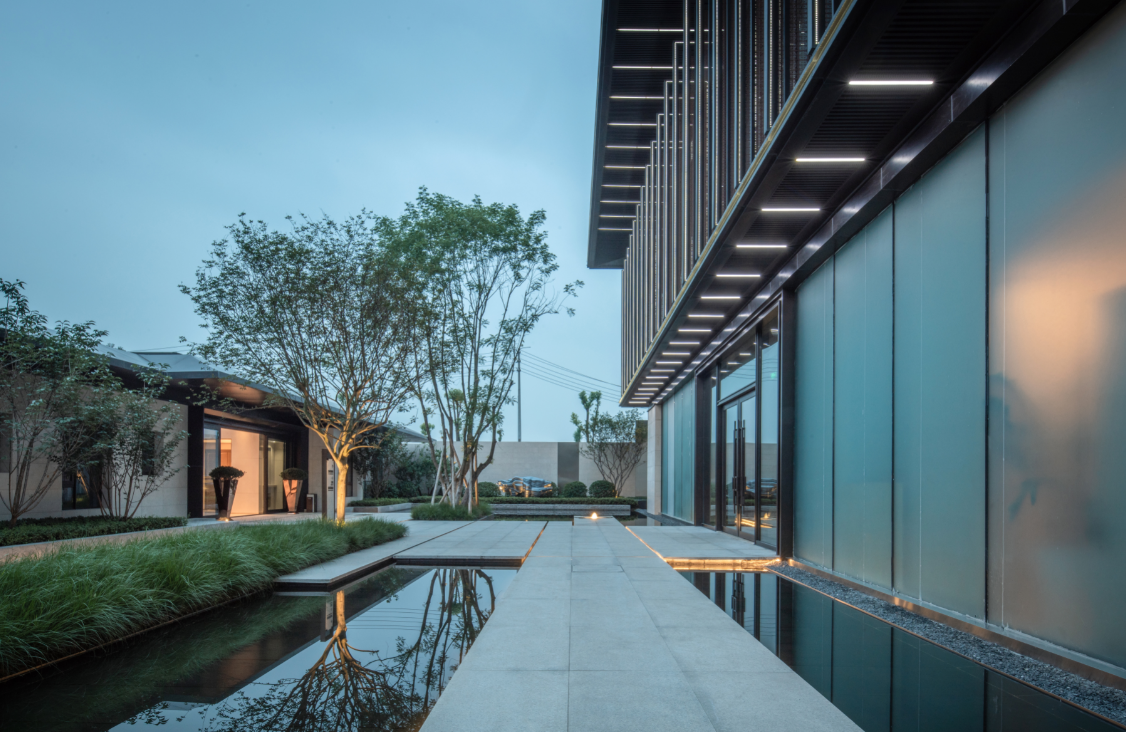 通過一側入室的路線,在場地中留出純粹的空間設置鏡面水景,瞬間打開空間的戲劇性。