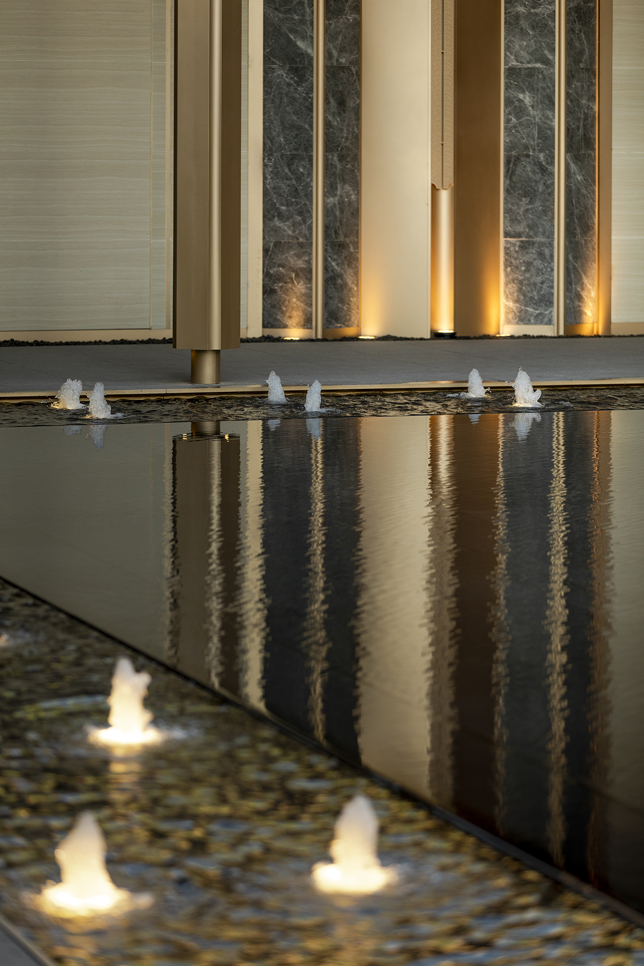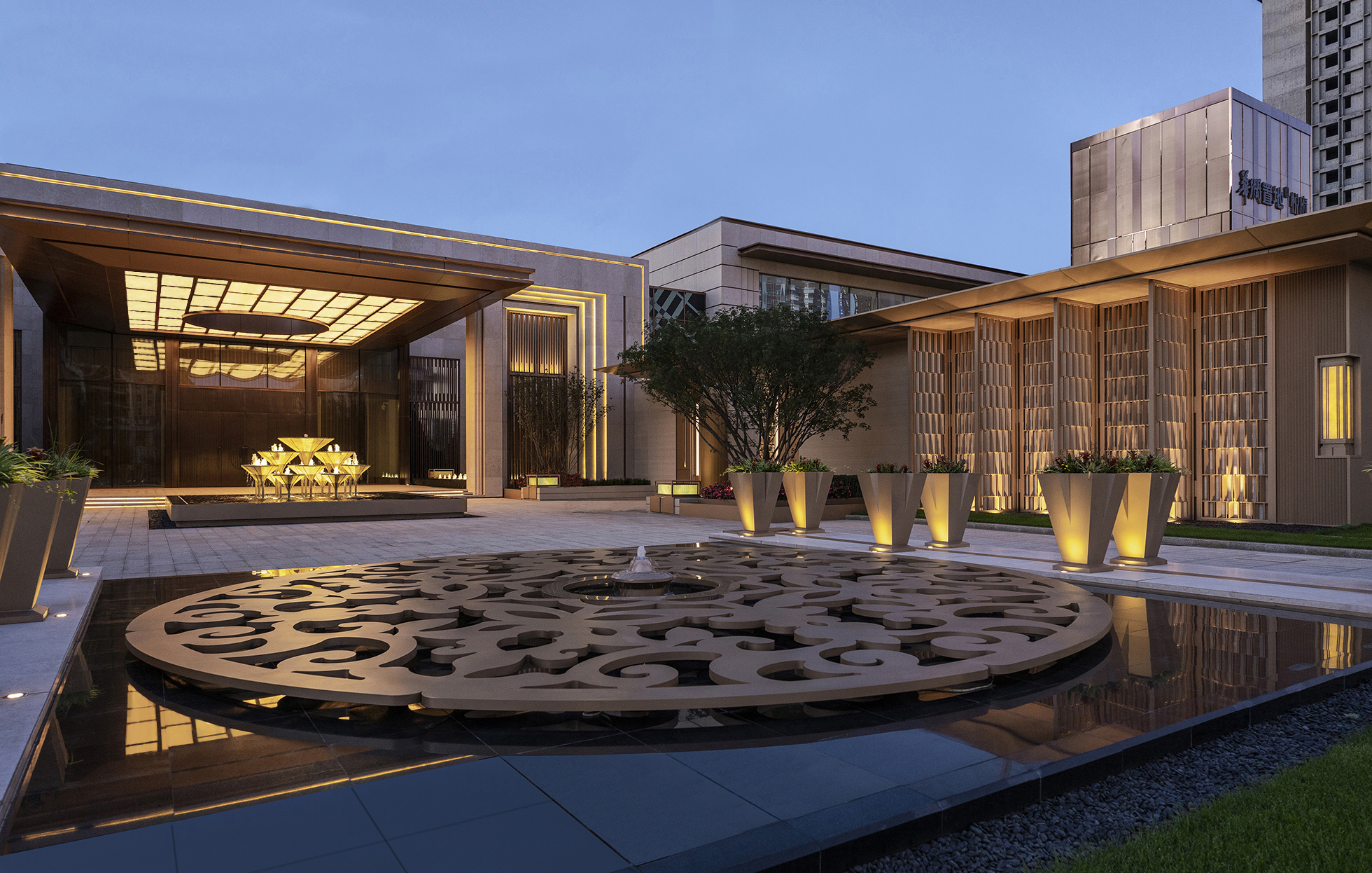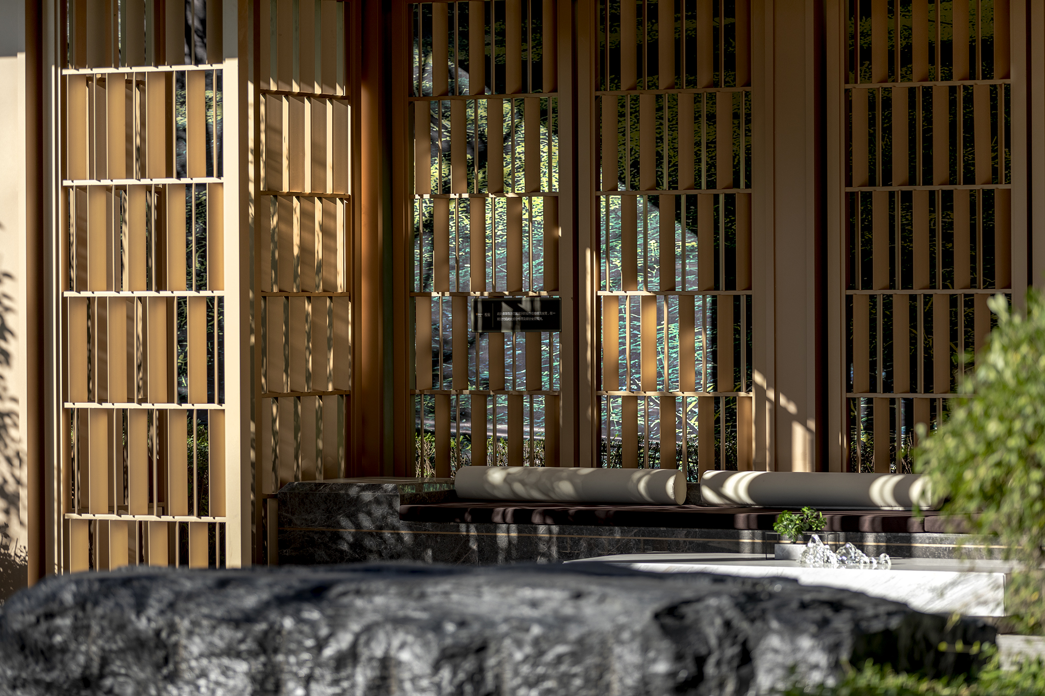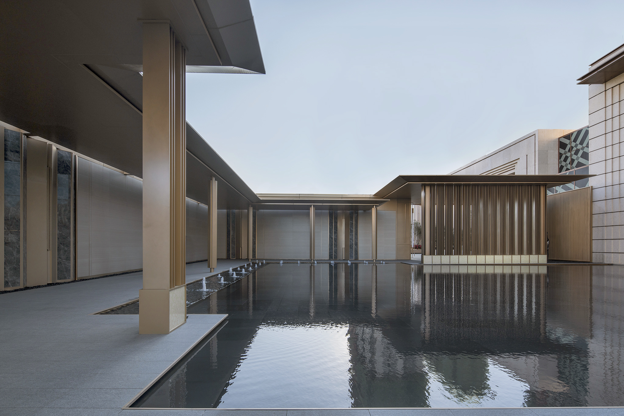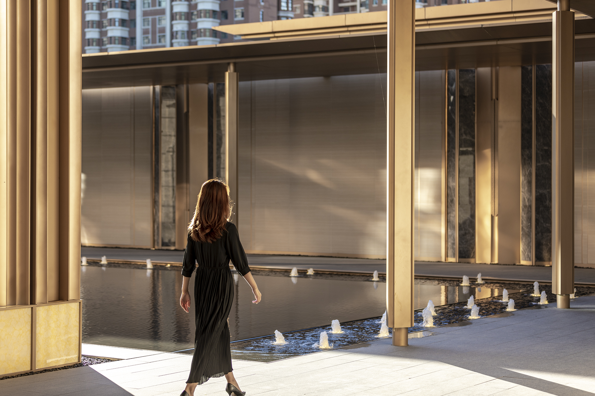 漫步于由風雨連廊圍合而成的水院,暖色與香檳色系成了這里的主色調,帶來了整體優(yōu)雅溫暖的感覺。