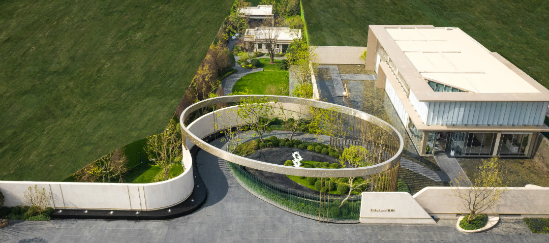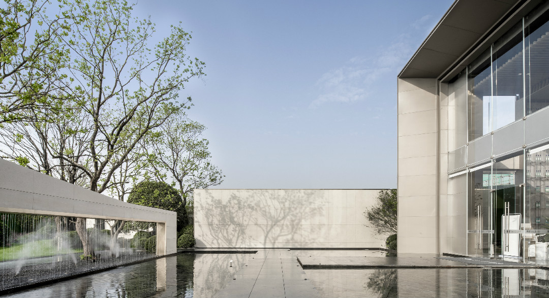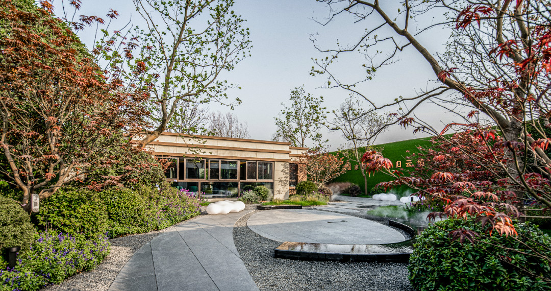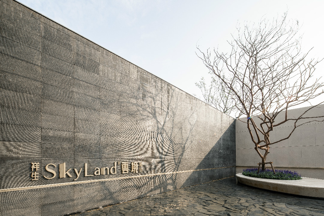 前場是“入則靜謐,出則繁華”的分界點——采用虛實結(jié)合之道,以分層次的米色實墻進行兩側(cè)圍合,