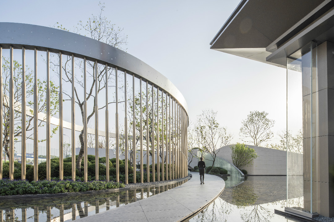 金色鋼柱和條形超白玻璃在中心有序排列,實現(xiàn)通透至半圍合的場景轉(zhuǎn)換。