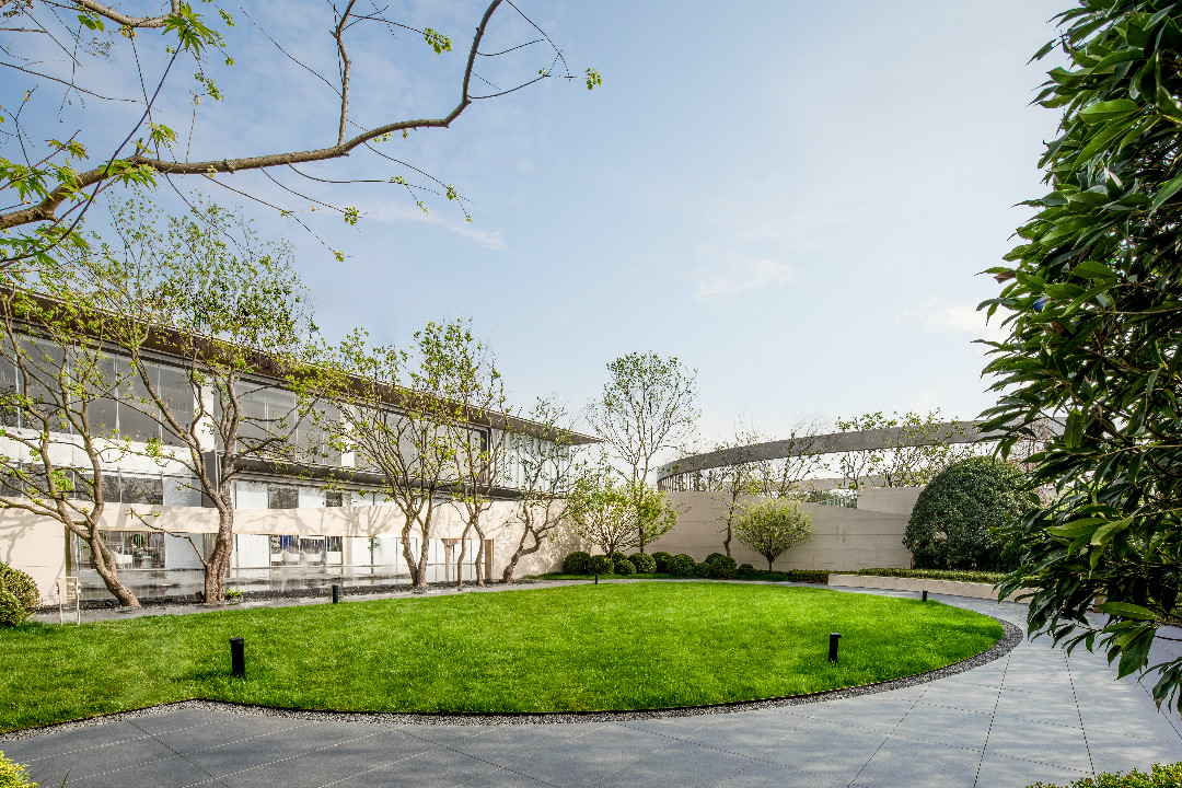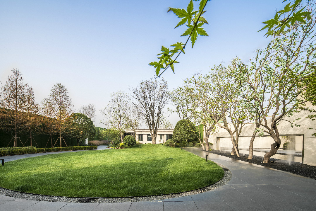 綿長的景墻,深沉的鋪裝,片植的滾球與整齊的藍紫色時花,無一不詮釋著純凈之美。