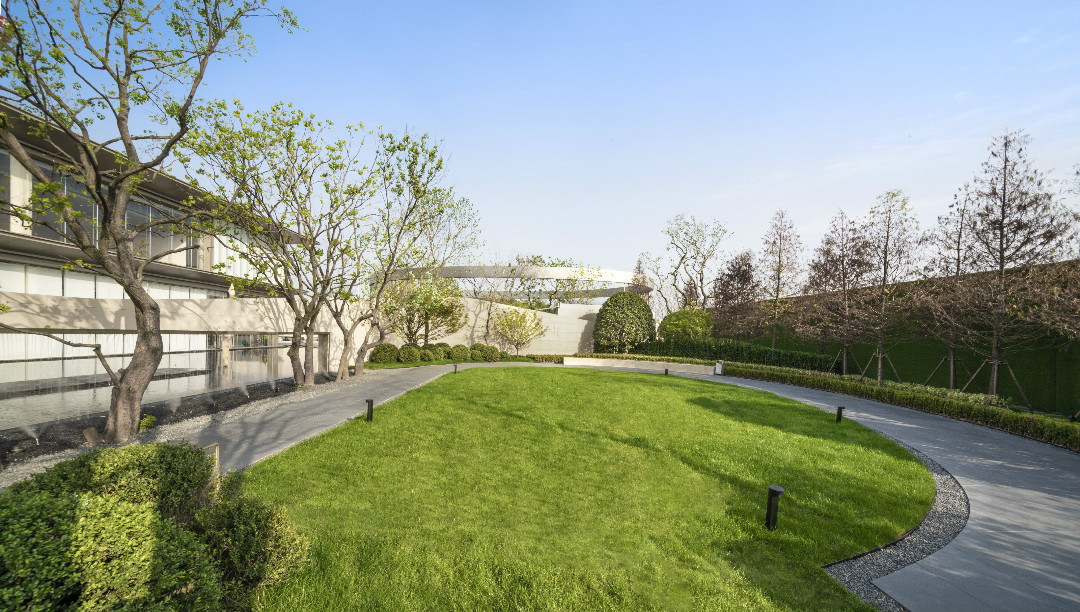 在陽光草坪和紅色落羽杉林的映襯下,后場空間顯得更為恬靜安寧,讓人忍不住上前小憩片刻。