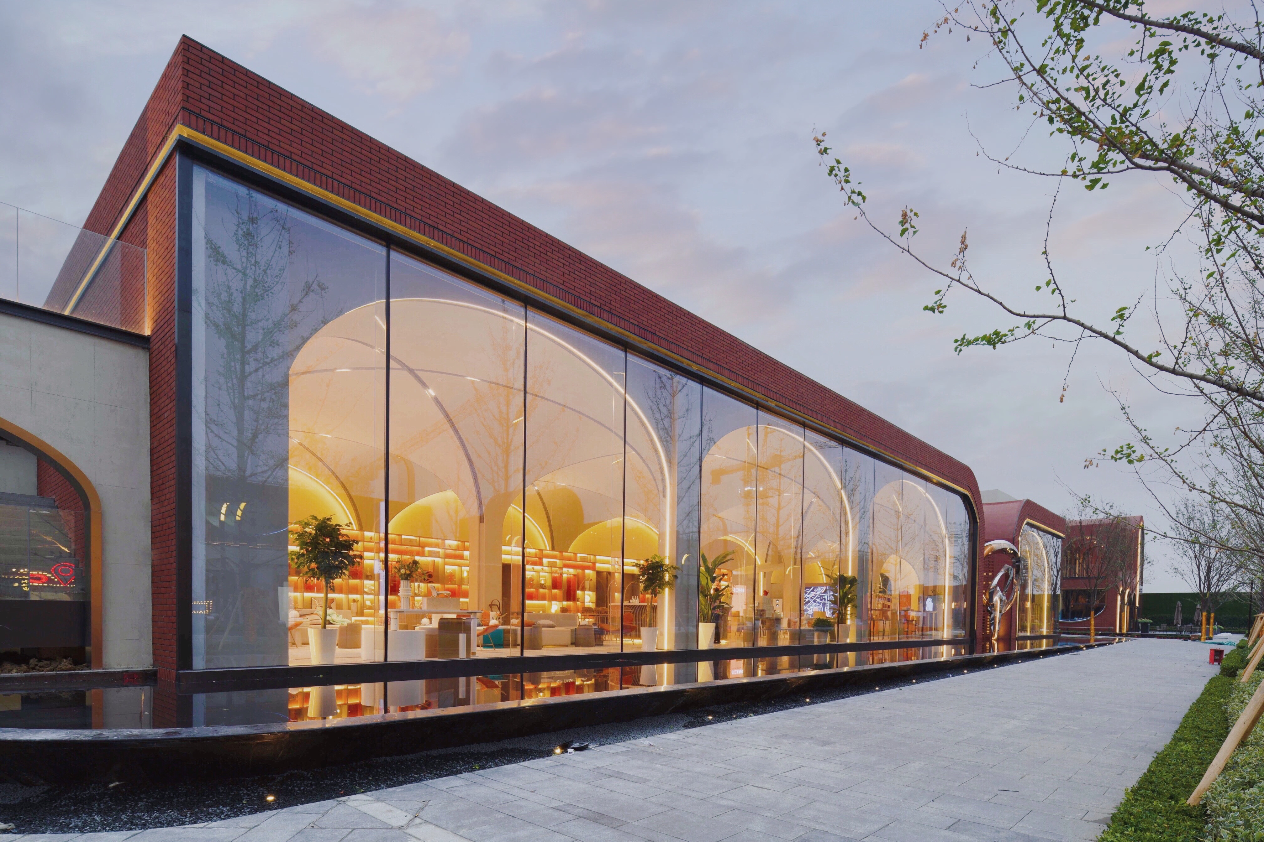 售樓建筑前水景一直延伸至半室內(nèi)空間,展現(xiàn)空間的連貫性,使街道更為整體和藝術(shù)。