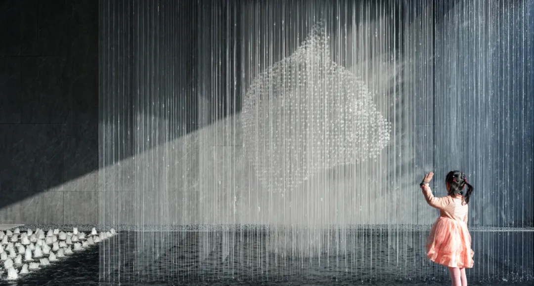垂直而下的雨簾中,加入光纖維與全息投影,我的形象被人類藝術(shù)化,搖身一變成項目IP形象“天妹”,靈動的貓頭造型在水簾中閃爍著,描繪出奇幻的視覺藝術(shù)。