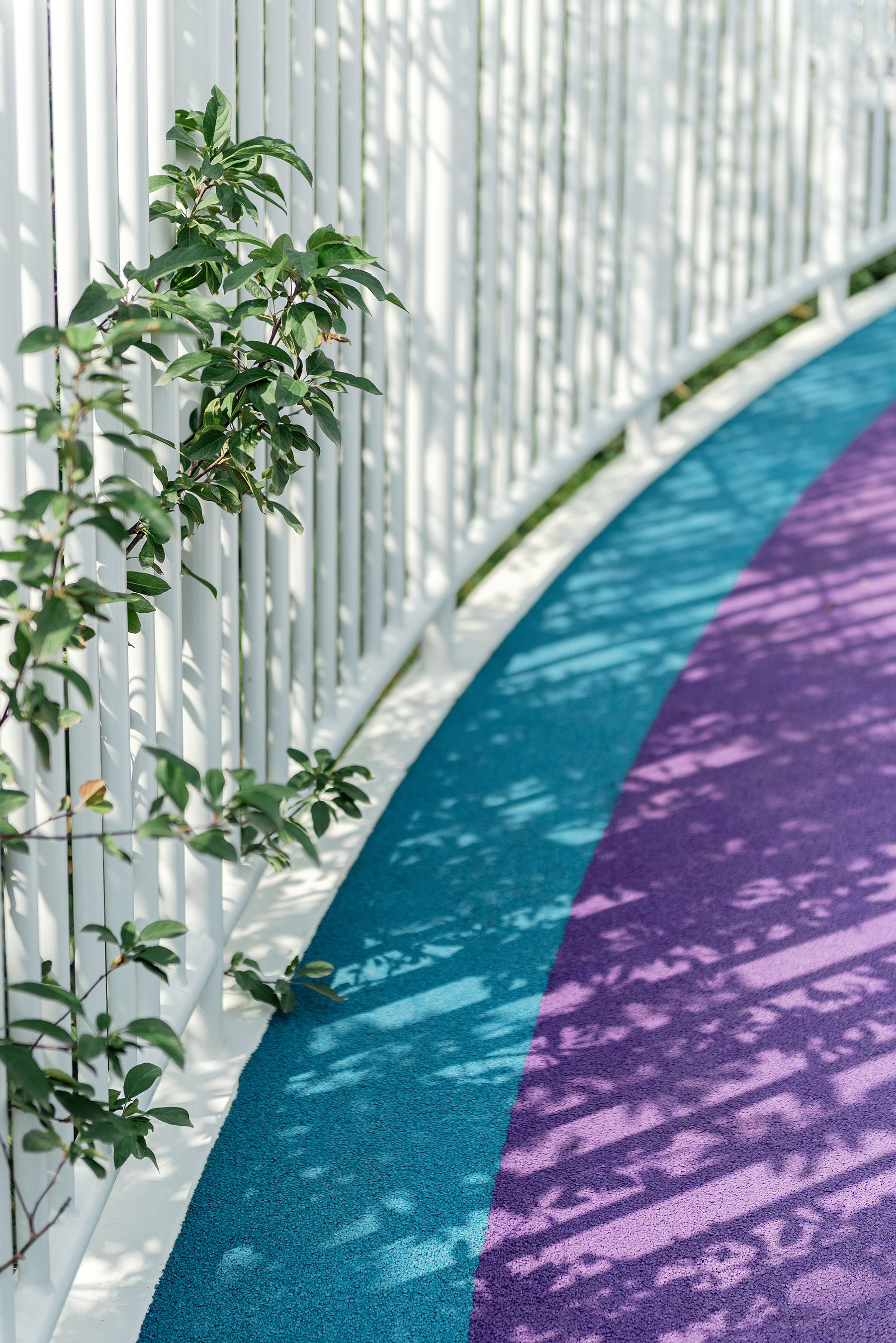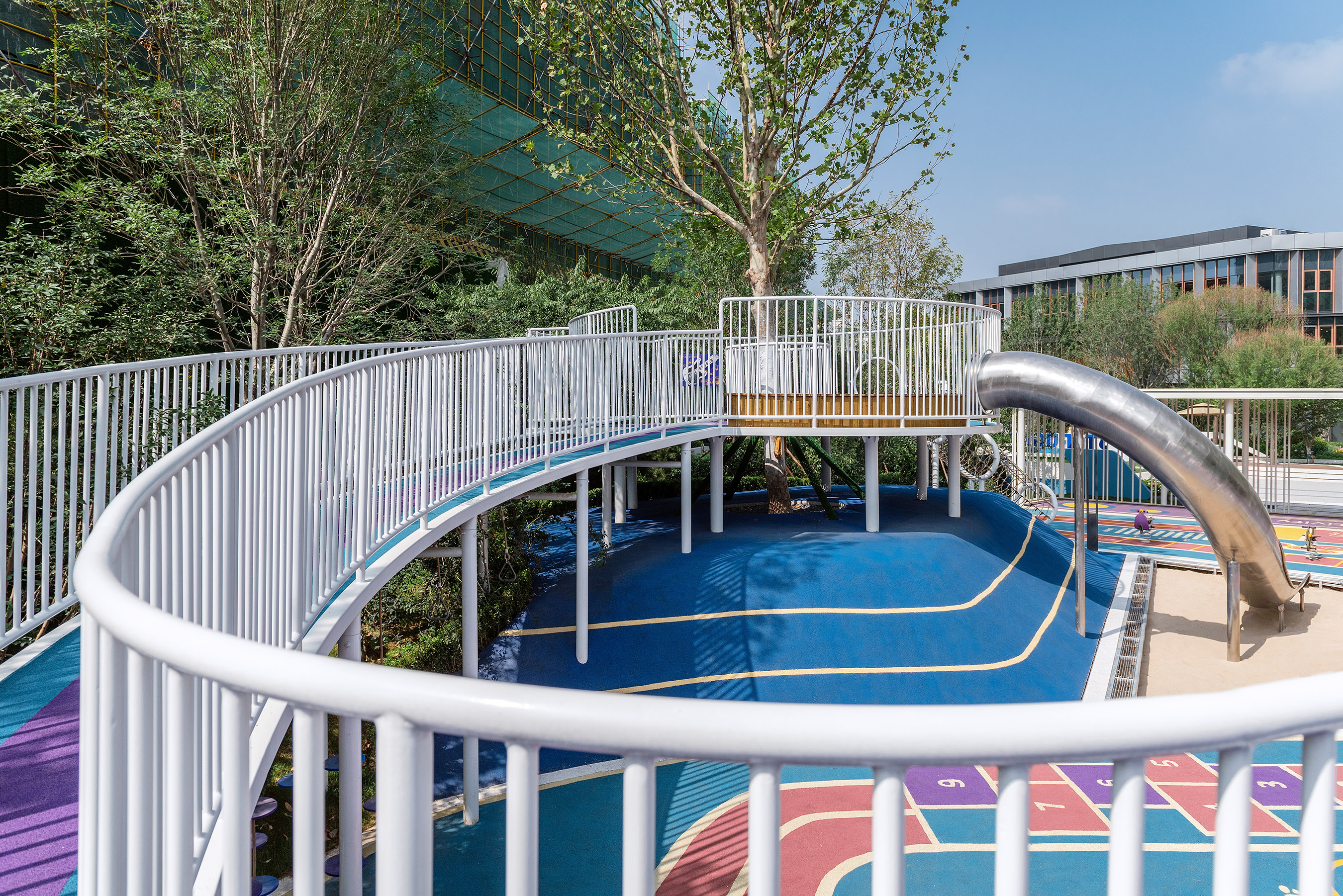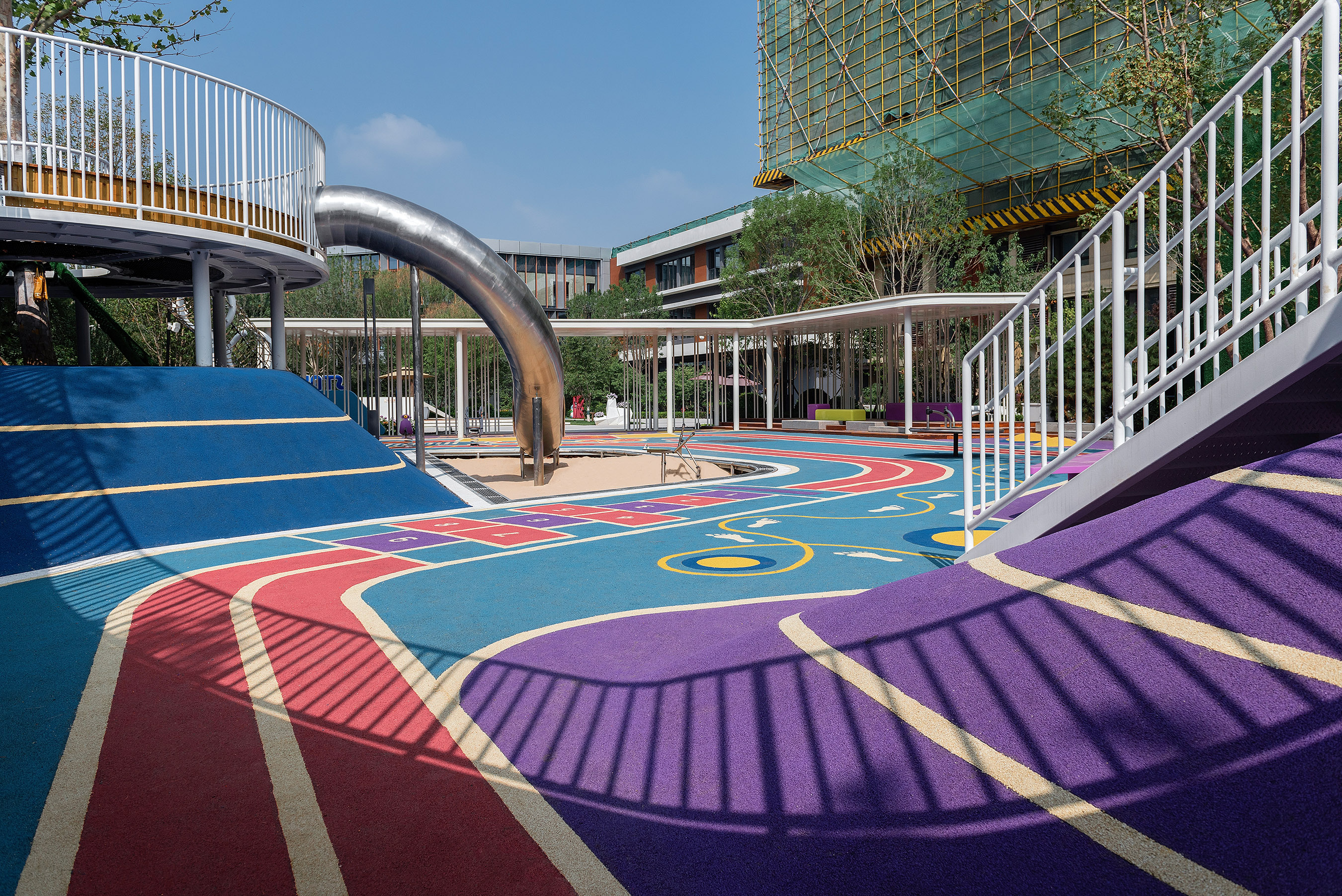空間中種下童年里的記憶大樹、旋轉(zhuǎn)滑梯、跑道等游樂元素,為孩童和家長們增加了互動(dòng)趣味感。