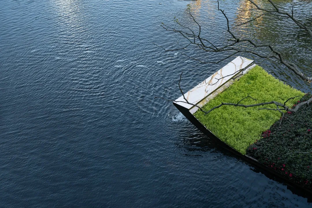 魚(yú)形雕塑浮在水面,魚(yú)尾仿佛隨著清風(fēng)擺動(dòng),粼粼波光之間,于喧囂生活中看見(jiàn)一抹悠然。