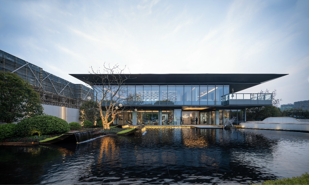 船型樹(shù)池疊水潺潺,鏡面水景結(jié)合特色跌水景觀,動(dòng)靜結(jié)合間構(gòu)建和諧的序列。