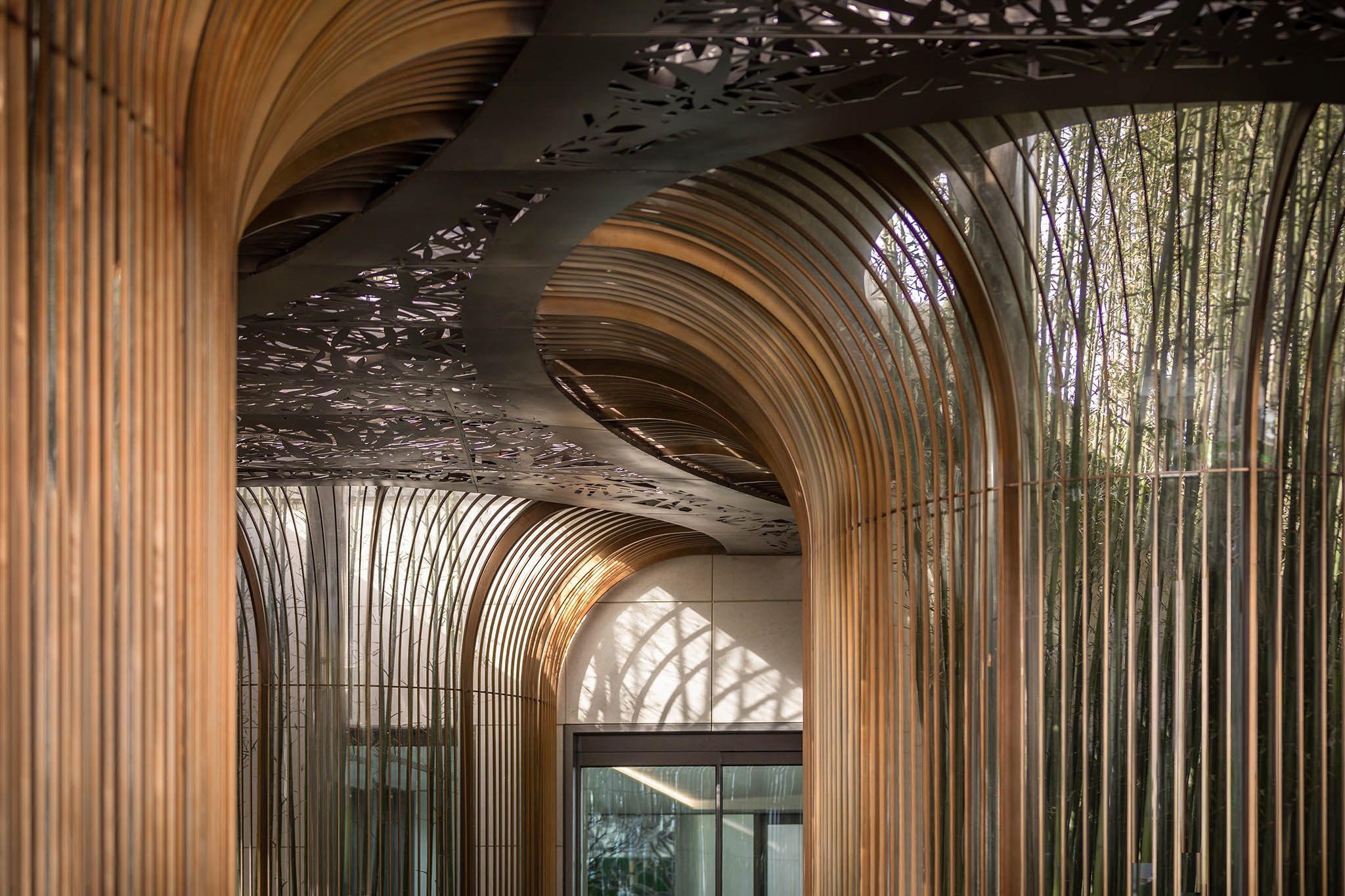 In the movement of space, "density" will affect the sensory experience, we hope it is not dense or open. The corridor of the main entrance cleverly takes the natural form of the bamboo clusters to create a level of spatial "perspective". When the sun shines, a scene of walking in a bamboo forest was created, developing a connection between people, space and nature.