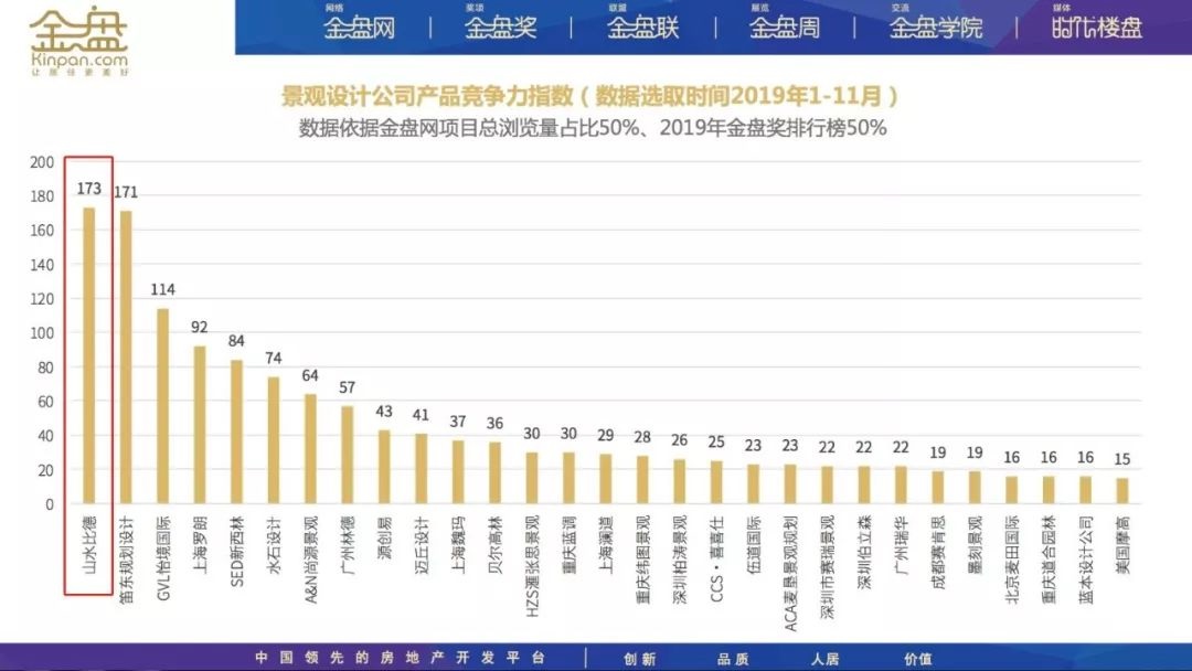 近日,第十四屆金盤獎(jiǎng)綜合類獎(jiǎng)項(xiàng)頒獎(jiǎng)典禮在廣州保利世貿(mào)博覽館舉行,頒發(fā)2019全年度六大類、37小類地產(chǎn)開發(fā)獎(jiǎng)項(xiàng)。山水比德項(xiàng)目共獲44項(xiàng)殊榮(含甲方、建筑方申報(bào)),及1項(xiàng)金盤人物獎(jiǎng),并且連續(xù)三年奪得景觀設(shè)計(jì)公司產(chǎn)品競(jìng)爭(zhēng)力指數(shù)排行榜全國(guó)第一!