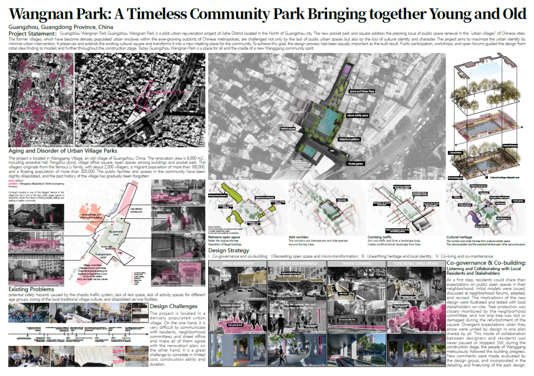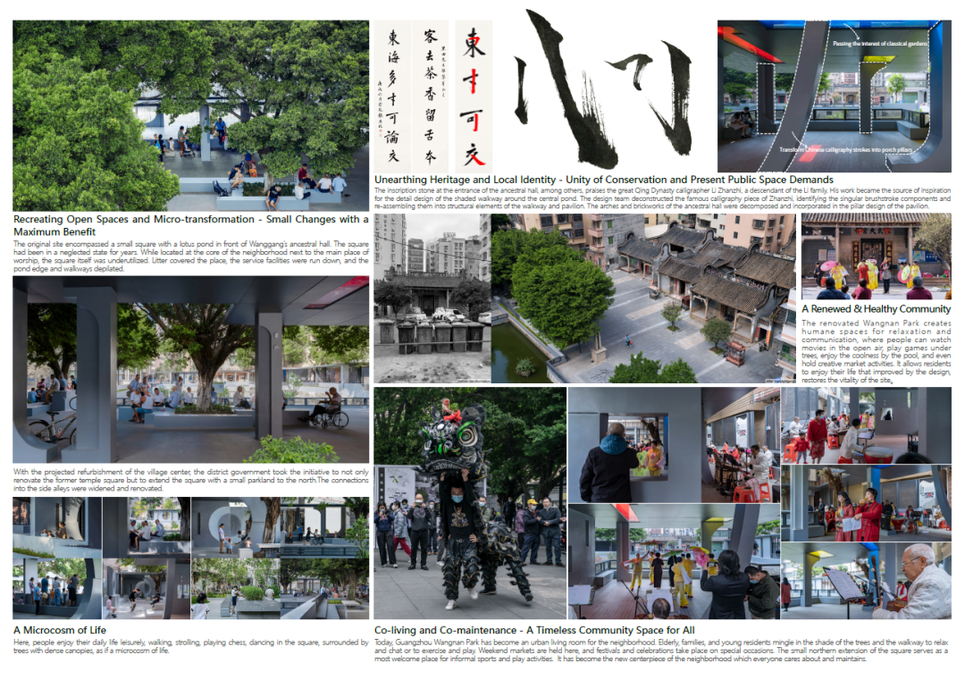 改造后的望崗村,賦予休憩與交往的人性空間,讓人們得以露天觀影、樹下對弈、池邊納涼,乃至舉行創(chuàng)意集市,讓居民切實感受到設(shè)計為生活體驗提升帶來的價值,重新煥發(fā)場地活力,提升環(huán)境品質(zhì)。廣州白云望南舊村改造項目是“身邊項目大師做”系列項目之一,是將廣州市白云區(qū)望南村中的老舊空間,進行人居環(huán)境更新后形成村域內(nèi)的社區(qū)公園。項目著眼于城市更新中的社區(qū)尺度,從關(guān)注市民需求、貼近市民生活的視角進行設(shè)計,為舊城的發(fā)展搭建了新的日常生活場景并注入了活力。這類以小項目為切入點探索城市更新機制的方法,對中國城市中的社區(qū)景觀更新有積極意義。